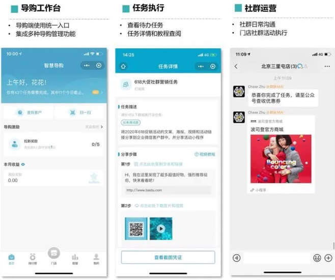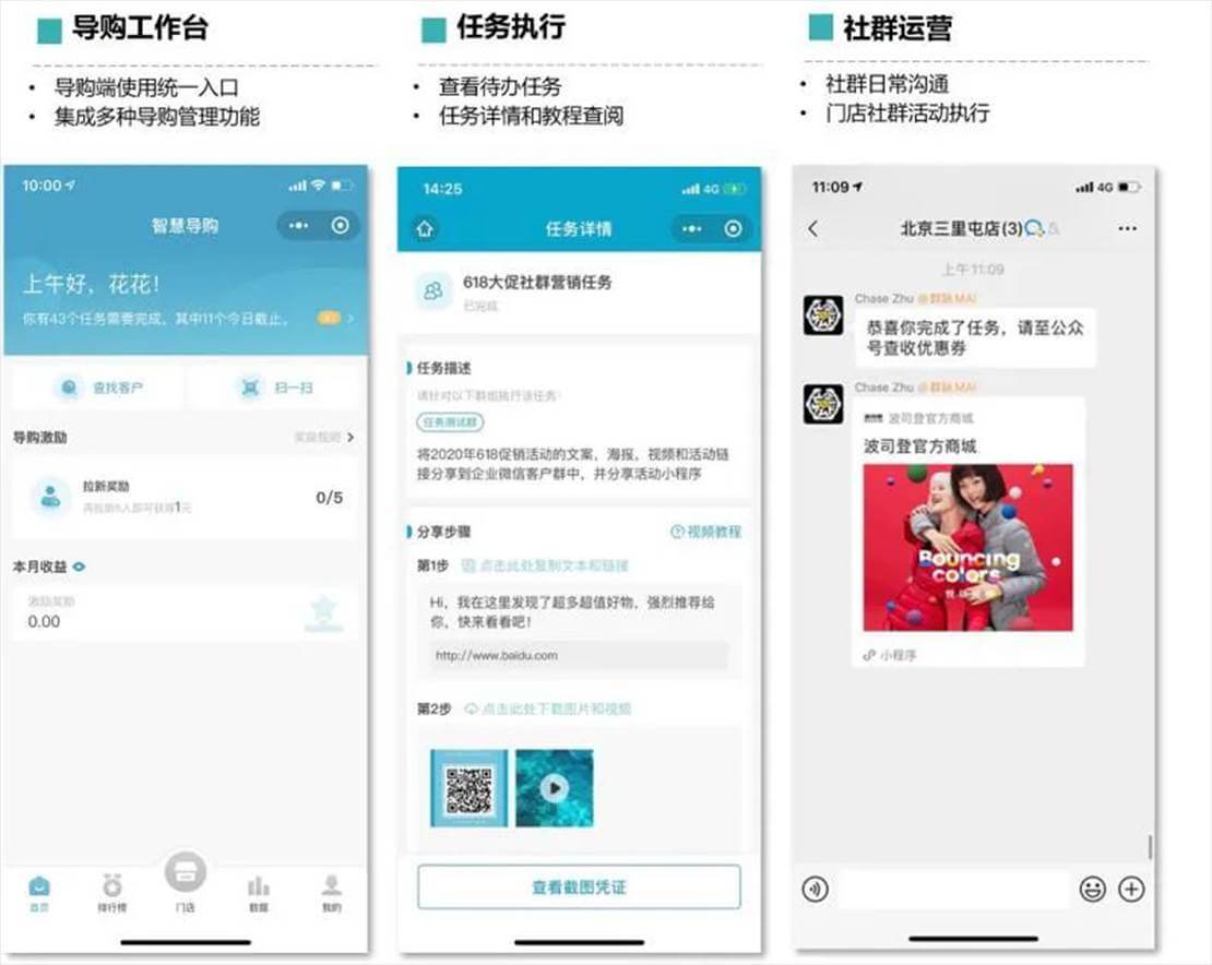 “微信加了,群建了,还要靠运营,才能达到我们最终的目标——销售。”朱爱国说,销售是终极目标。2020年初,群脉为波司登搭建了一个基于私域的任务平台,为导购做了分析顾客的工作。“他是什么年龄段?审美是偏潮人,还是注重性价比?平台都会告诉导购。”群脉销售市场副总裁万思澄说。每个导购早上拿起手机,都可以先打开自己的企业微信,界面上有一个叫作“优客”的按钮,点击进入,导购会收到各种信息、任务、工具和素材,这是她全天24小时的线上工作助手。