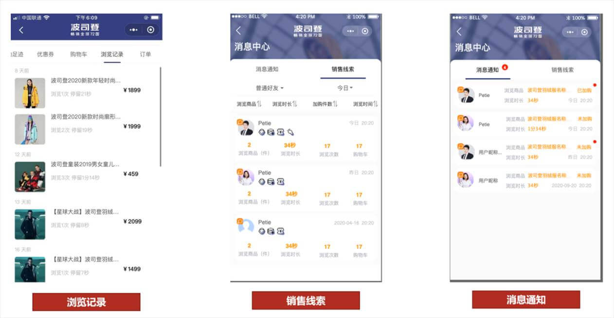 另一个工具是企业微信,推出时间不算长,而波司登已经完成了普及,全国约1.2万名导购都安装了企业微信,拥有自己的ID。对顾客来说,企业微信看起来和私人微信没什么差别,但对导购、店长,乃至更高的管理层,企业微信将管理效率提升了许多倍。
