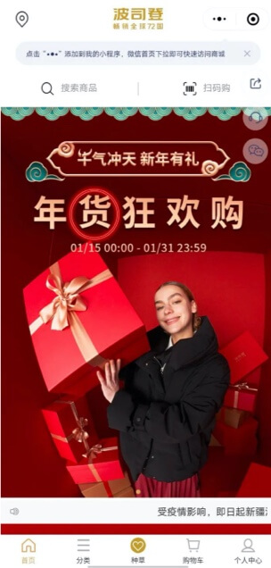 疫情之前,波司登刚刚在上海、南通和杭州三个城市开启私域运营的实验,运用小程序商城和企业微信,帮助门店不断扩充线上会员。这个实验性的通路在疫情下变成了唯一的出路:关闭的门店如果还想有业绩,就只能依靠导购,通过小程序商城来销售。好在波司登早前已经建立了成熟的小程序体系,每家实体店对应的小程序各不相同,千店千面,都有贴合各自商圈或街区的个性化设计。